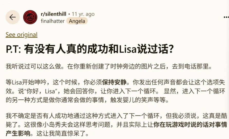 这一机制的意义在于,它巧妙地将游戏中的“互动”从显性的操作转化为潜移默化的体验。玩家往往无法清楚地意识到自己正在“触发”某个机制,而只会感到某种诡异的变化在注视中悄然展开。这种设计一方面打破了传统的“机关—解谜”模式,使游戏的进程与玩家的心理状态产生了更紧密的关联;另一方面,它极大增强了不确定性和不安感,让玩家时刻怀疑“是否是自己导致了某种变化”。更重要的是,另一位玩家在写下的玩后感中提到,他认为没有人可以真正解开《P.T.》的谜团。因为在他所搜集到的讨论和资料中,很多玩家的通关教程都彼此矛盾,互不印证。